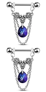 14GA Stainless Steel Triple Flower Dangling Crystal Chains Nipple Barbells